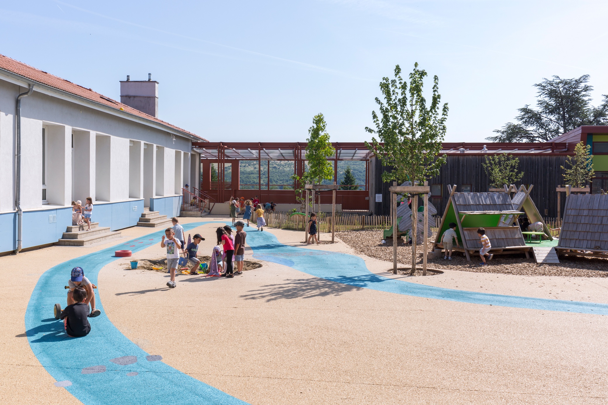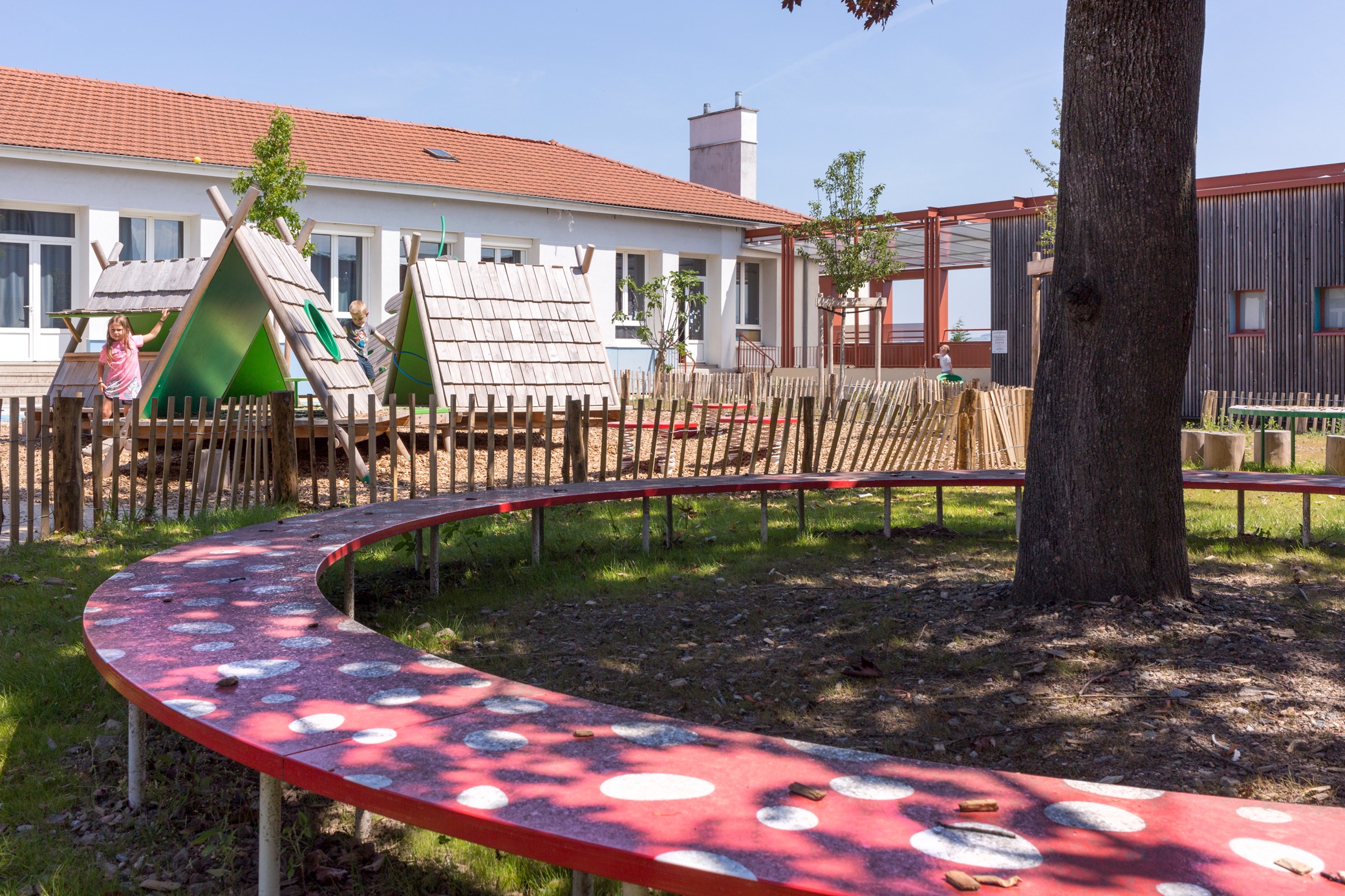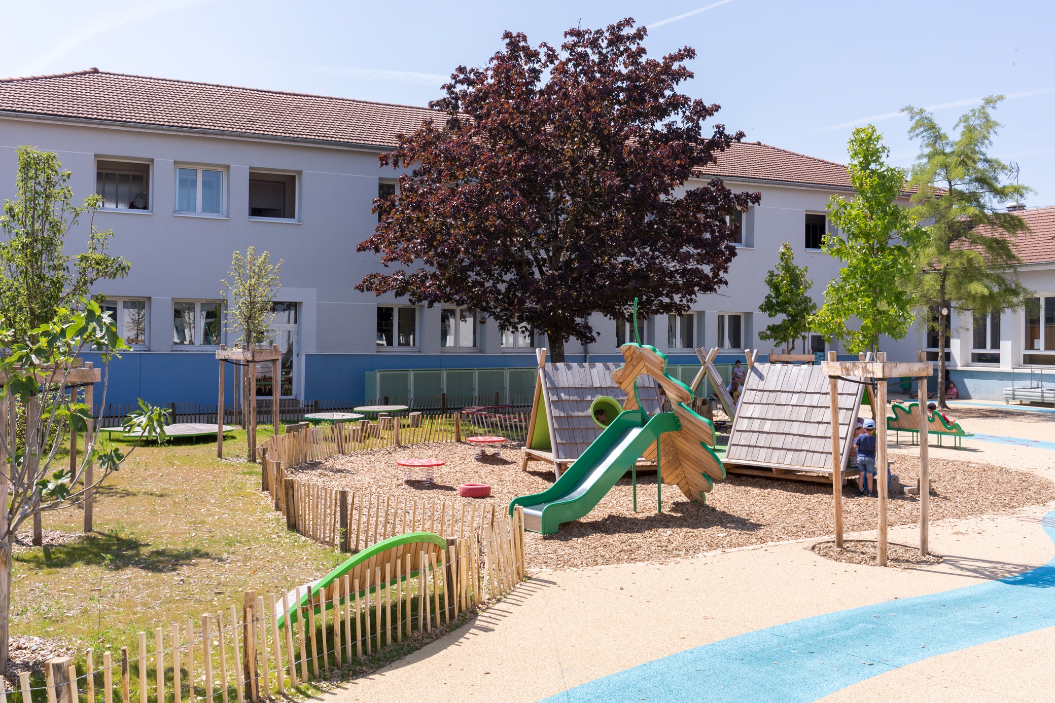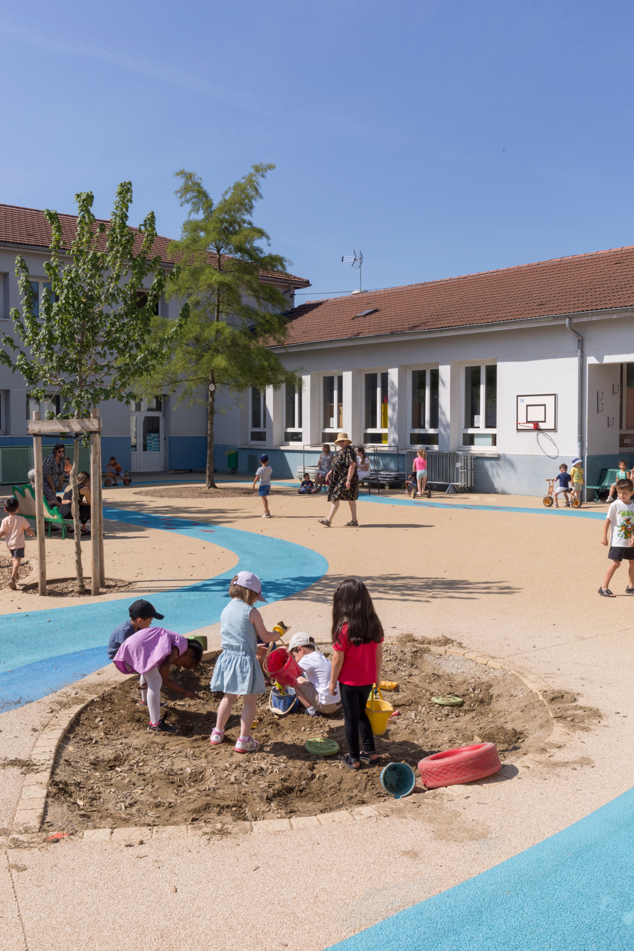 L’aménagement propose un juste équilibre entre espaces calmes et jardins pédagogiques en pleine terre sur environ 50% des cours et espaces actifs avec des îles de copeaux de bois et des zones libres pour courir, faire du vélo, en béton drainant.