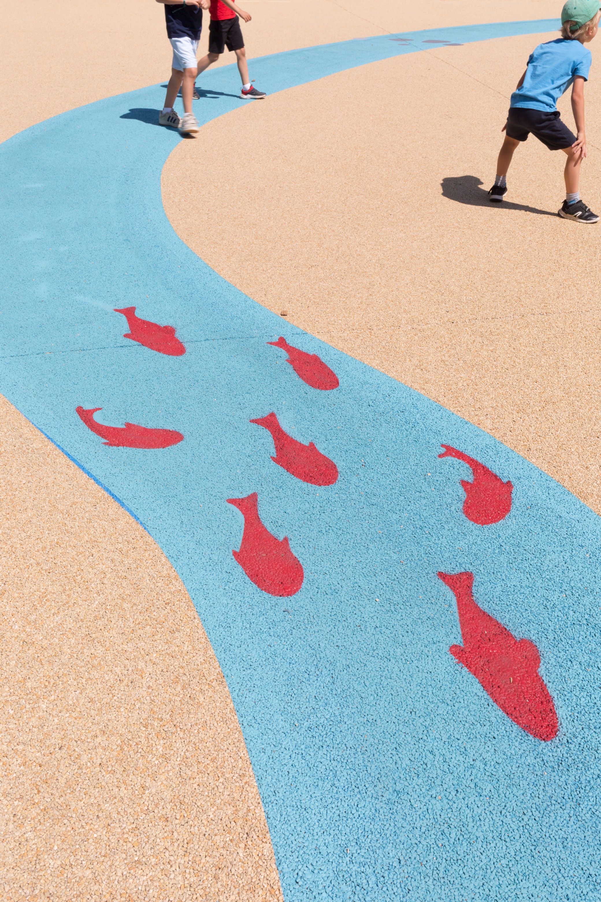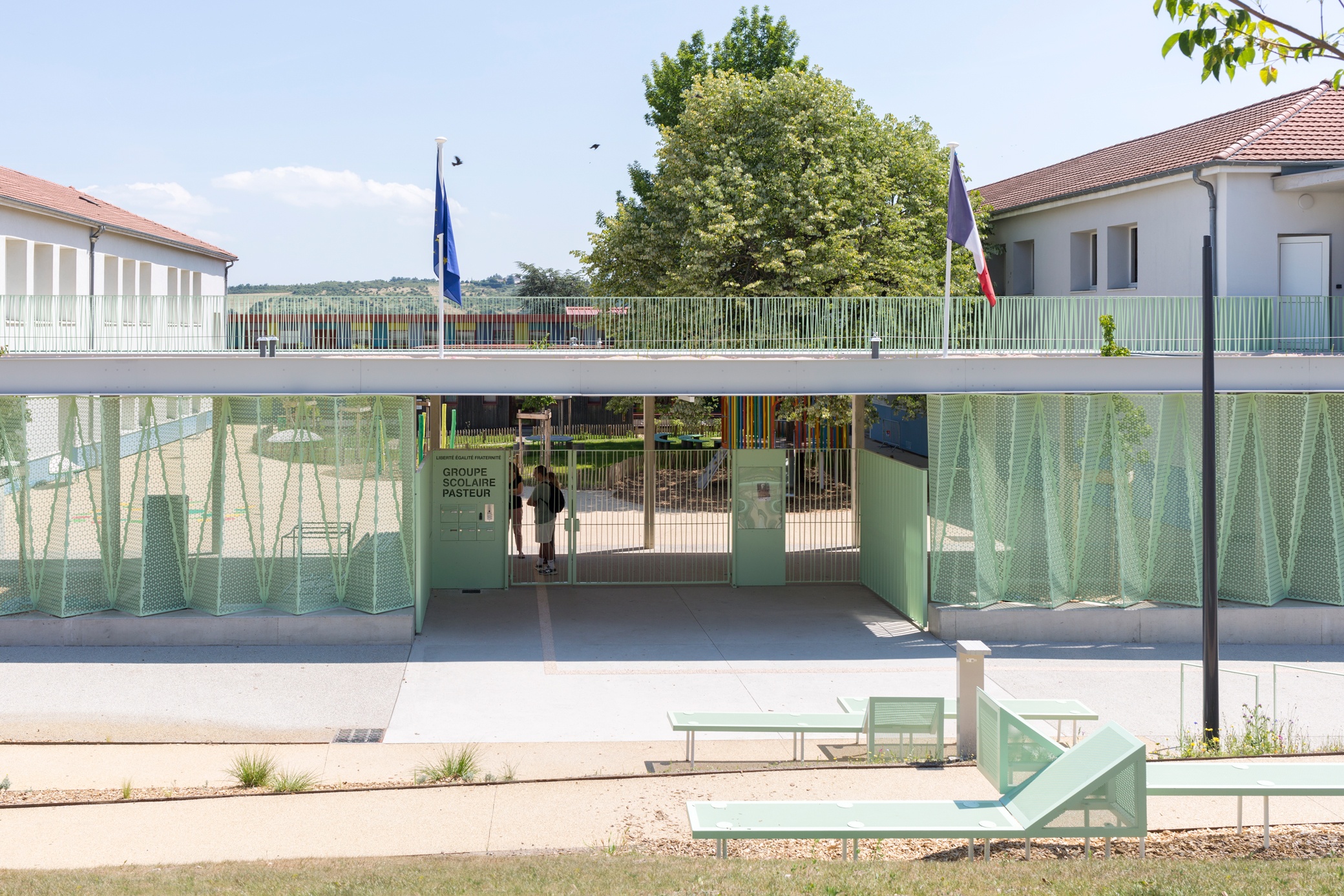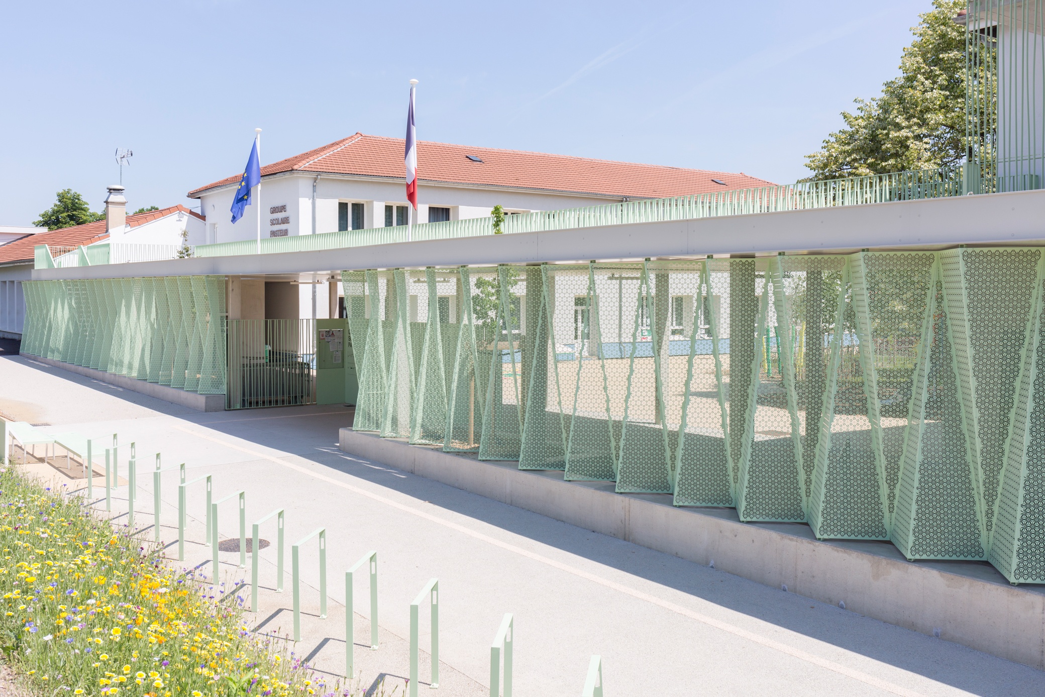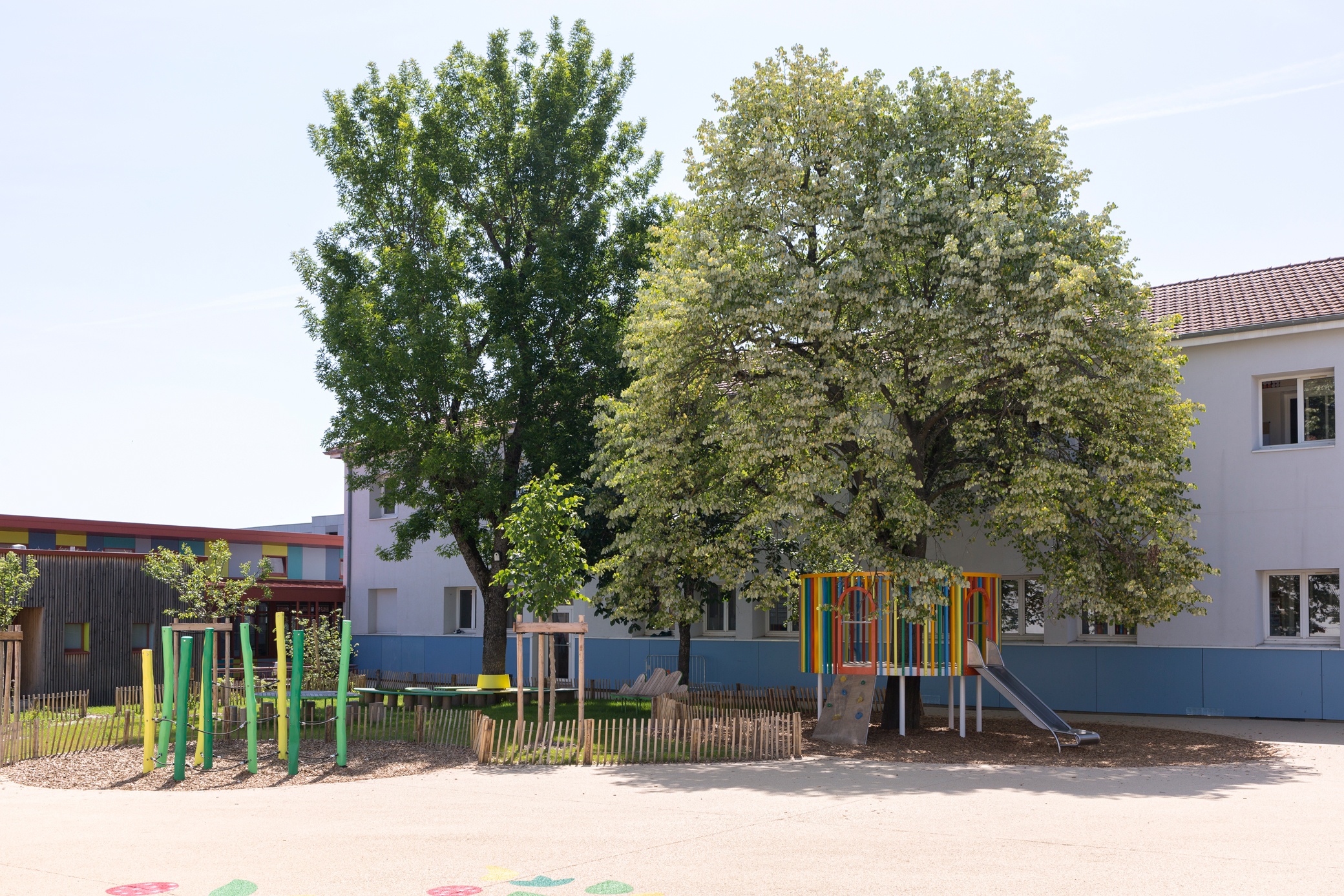 L’aménagement propose un juste équilibre entre espaces calmes et jardins pédagogiques en pleine terre sur environ 50% des cours et espaces actifs avec des îles de copeaux de bois et des zones libres pour courir, faire du vélo, en béton drainant.