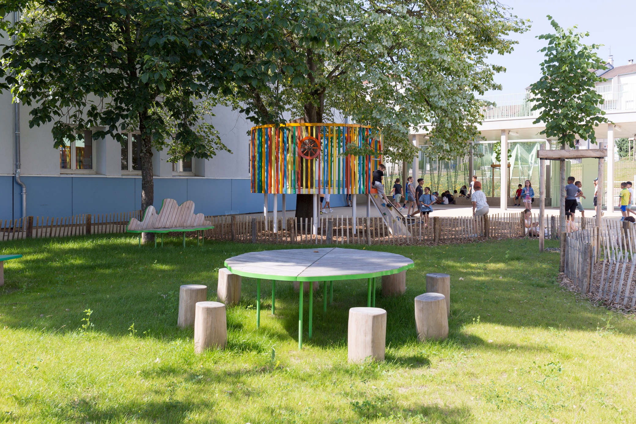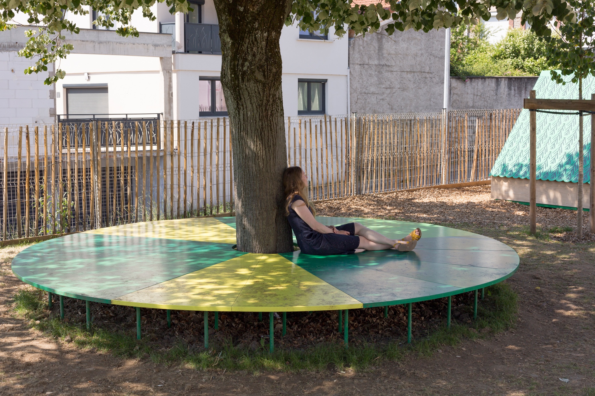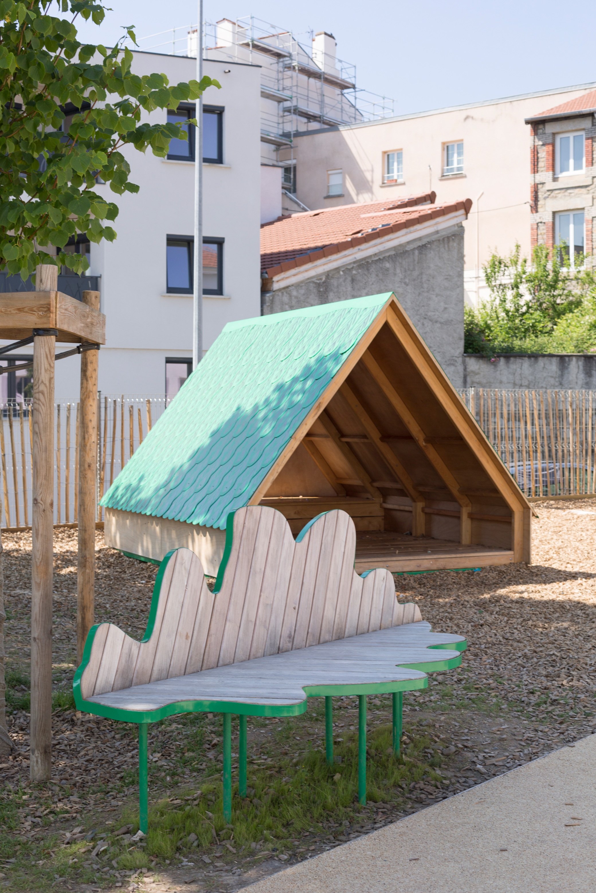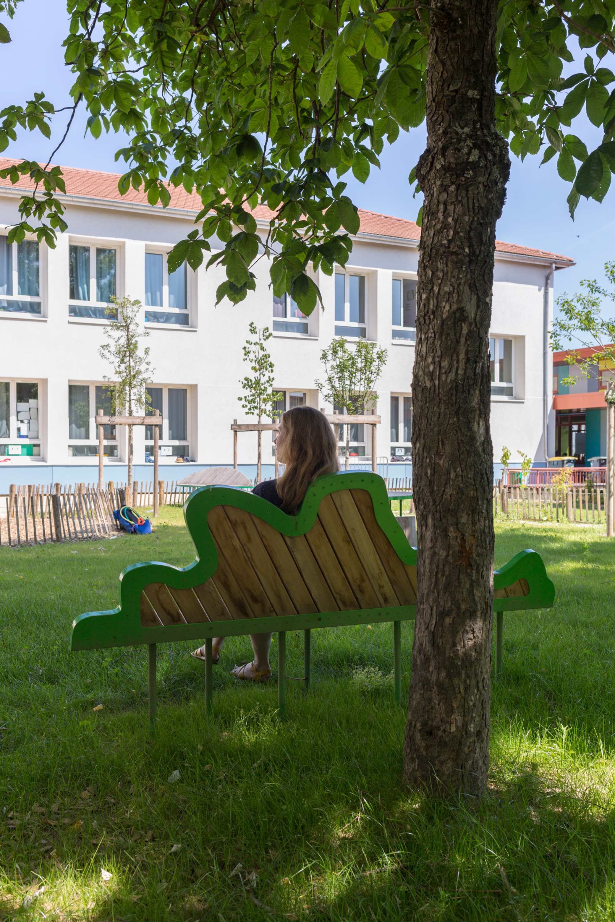 à l’école des forêts est un projet co-conçu avec les élèves de l’école pour la réinvention des 3 cours de récréation de l’école. Au cours des ateliers pédagogiques menés, les enfants ont exprimé leur attachement aux arbres existants et une envie de nature. Tous les mobiliers et jeux ont été dessinés sur-mesure pour le projets inspirés des différents ateliers « autour de mon arbre », « mon jardin », ma cabane idéale ». Cela a donné lieu à une cabane coloré autour d’un tilleul, à une collection de mobilier feuilles (chêne, magnolia, tilleuil) déclinés en tables pour jouer, goûter, dessiner, en plateformes pour se reposer, en bancs, en toboggan, à des champignons ressorts ou un grand banc amanite, etc.