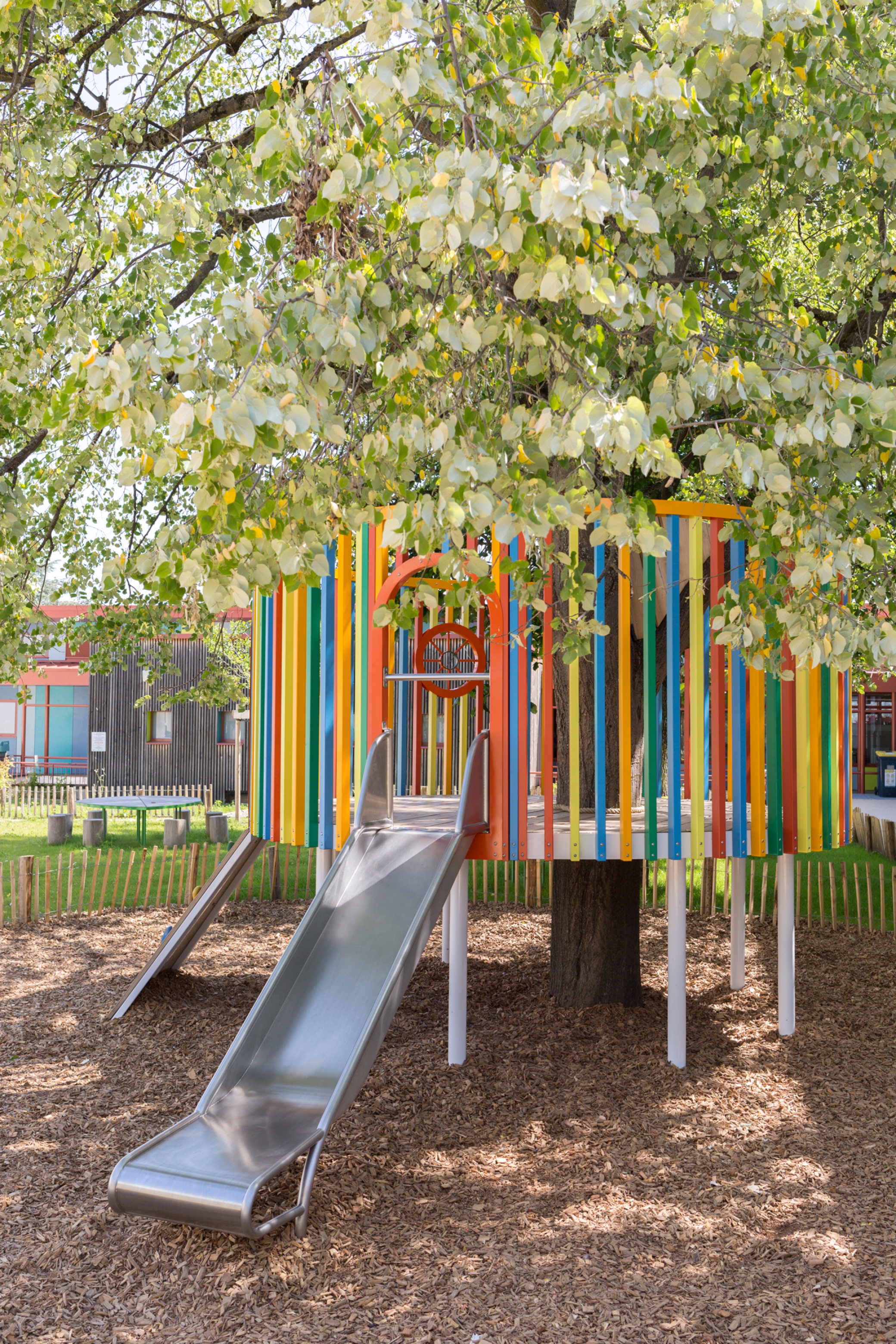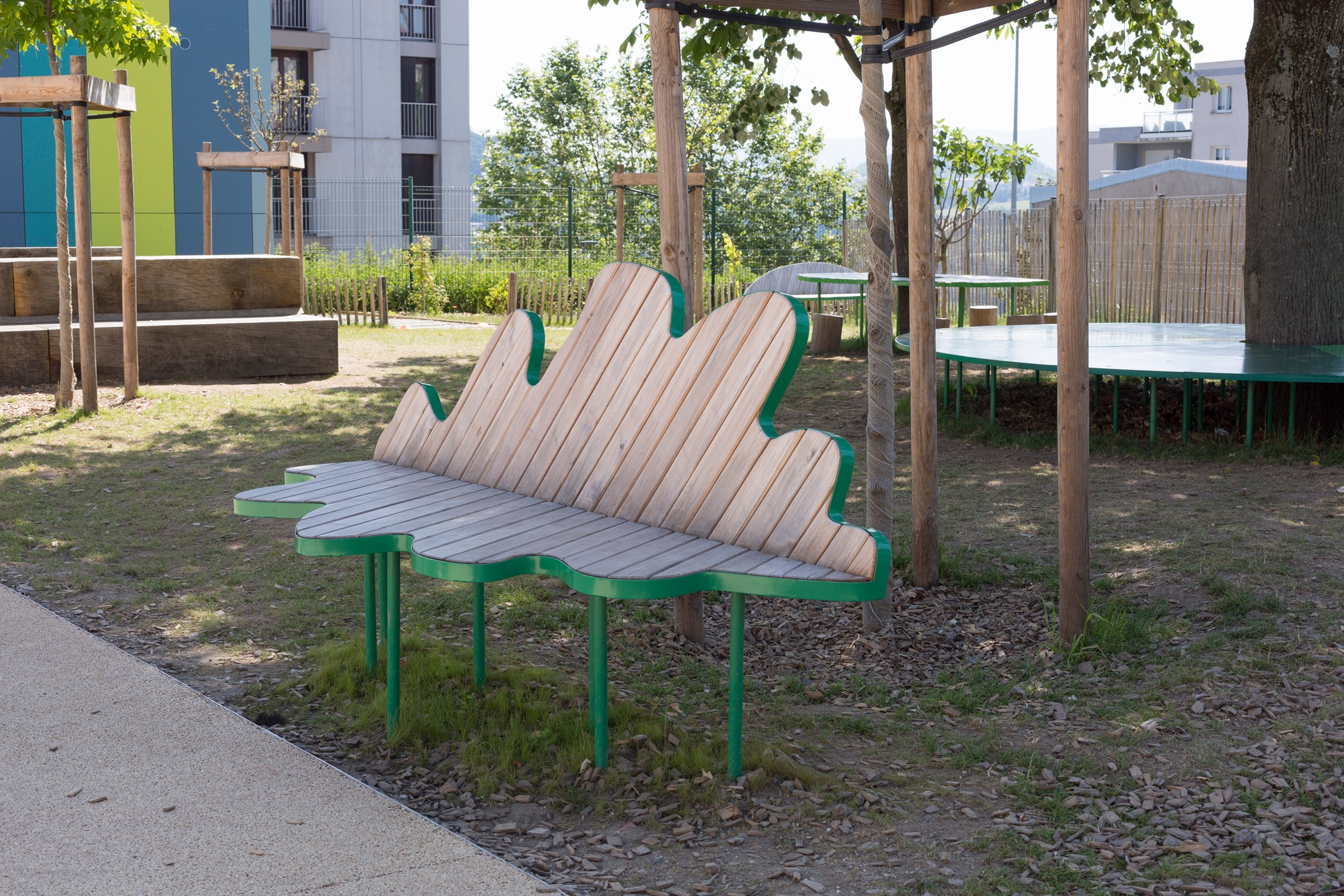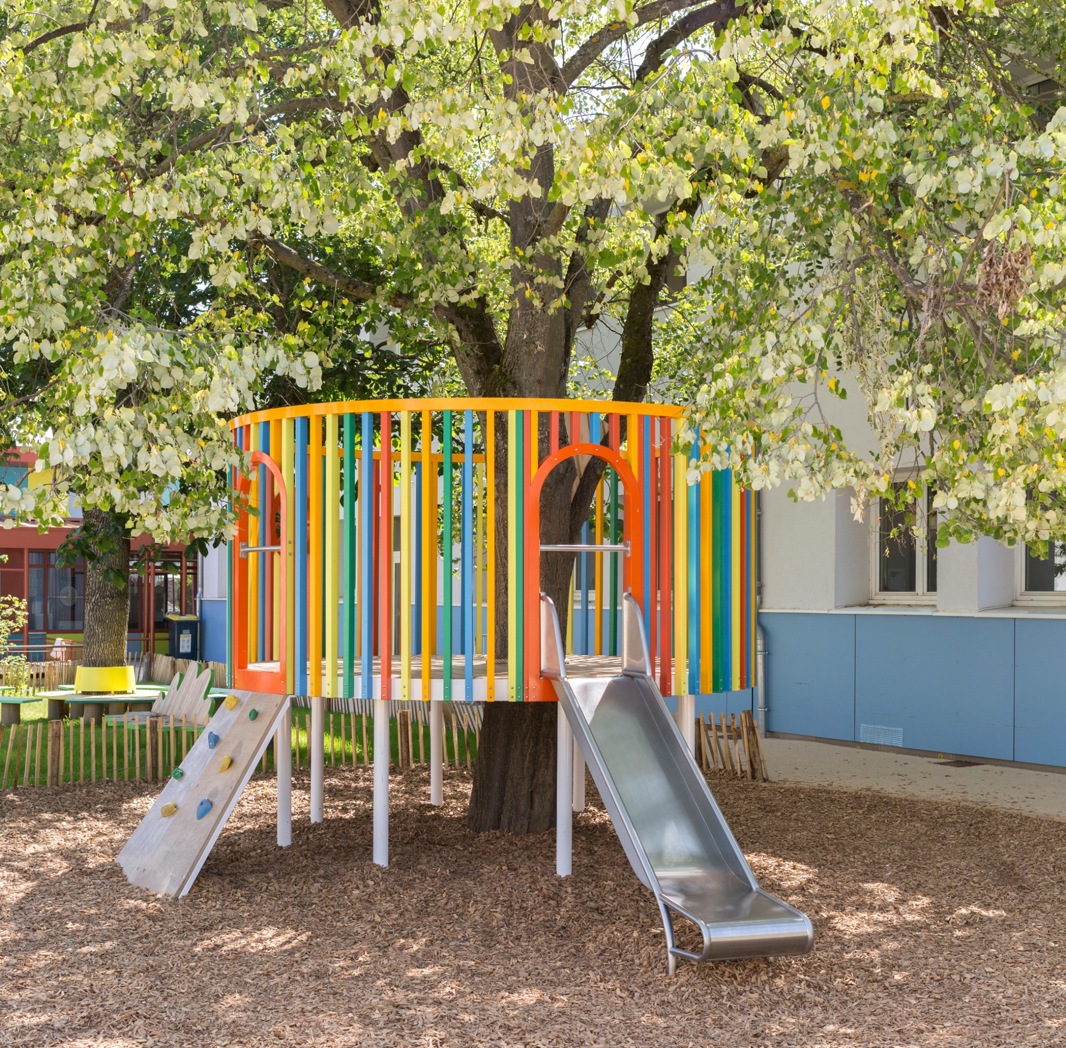 à l’école des forêts est un projet co-conçu avec les élèves de l’école pour la réinvention des 3 cours de récréation de l’école. Au cours des ateliers pédagogiques menés, les enfants ont exprimé leur attachement aux arbres existants et une envie de nature. Tous les mobiliers et jeux ont été dessinés sur-mesure pour le projets inspirés des différents ateliers « autour de mon arbre », « mon jardin », ma cabane idéale ». Cela a donné lieu à une cabane coloré autour d’un tilleul, à une collection de mobilier feuilles (chêne, magnolia, tilleuil) déclinés en tables pour jouer, goûter, dessiner, en plateformes pour se reposer, en bancs, en toboggan, à des champignons ressorts ou un grand banc amanite, etc.
