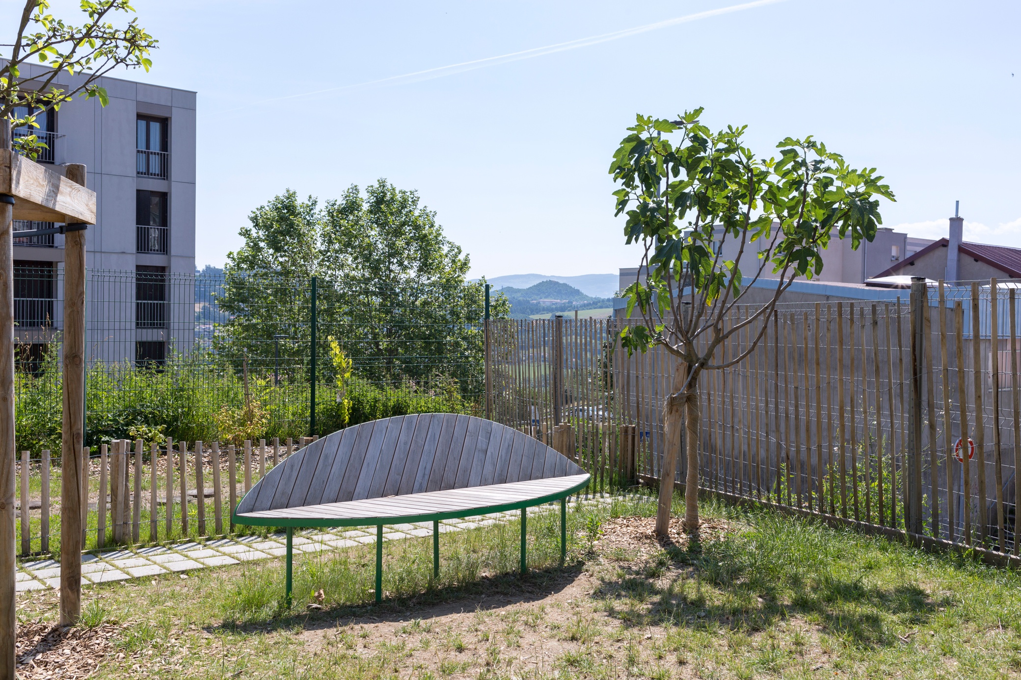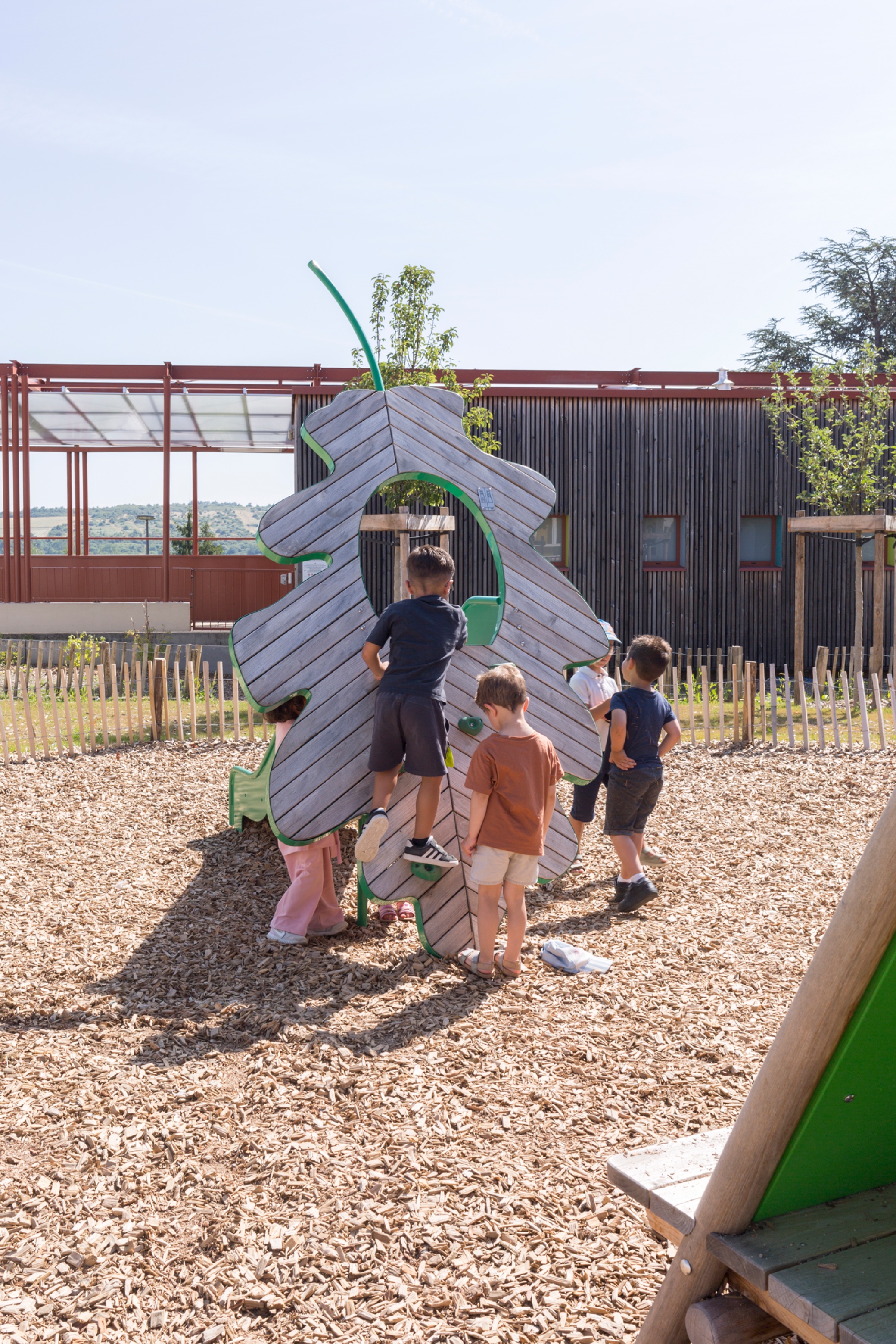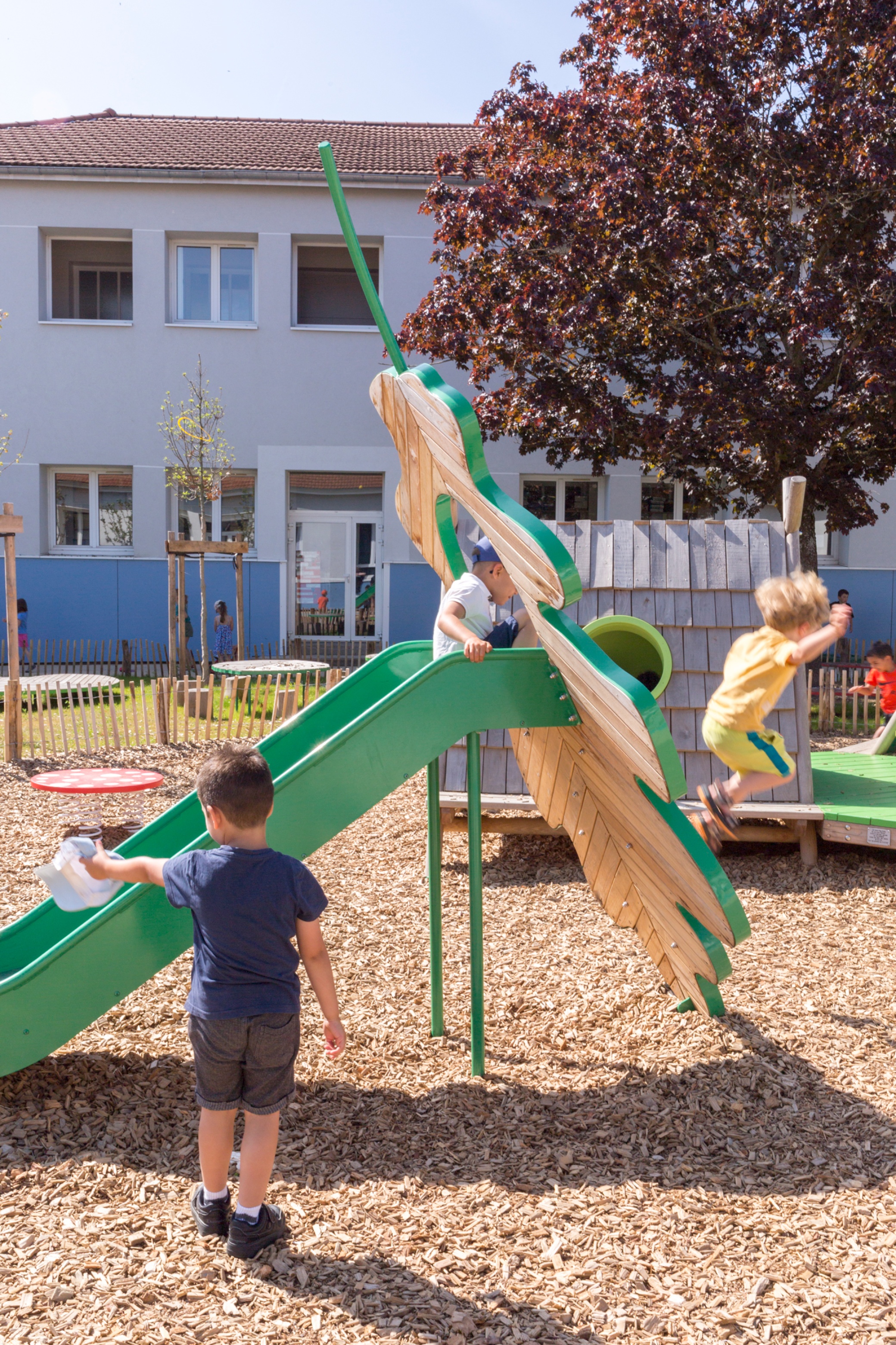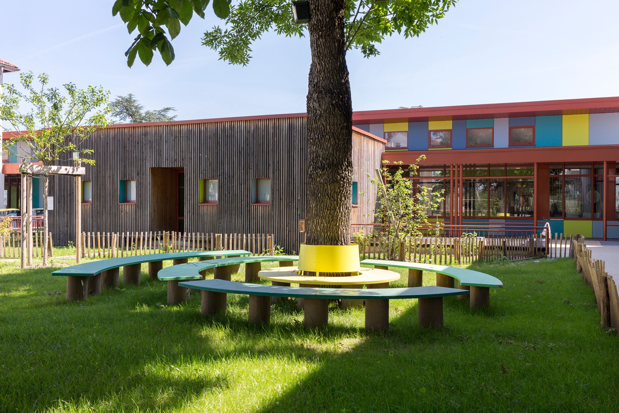 à l’école des forêts est un projet co-conçu avec les élèves de l’école pour la réinvention des 3 cours de récréation de l’école. Au cours des ateliers pédagogiques menés, les enfants ont exprimé leur attachement aux arbres existants et une envie de nature. Tous les mobiliers et jeux ont été dessinés sur-mesure pour le projets inspirés des différents ateliers « autour de mon arbre », « mon jardin », ma cabane idéale ». Cela a donné lieu à une cabane coloré autour d’un tilleul, à une collection de mobilier feuilles (chêne, magnolia, tilleuil) déclinés en tables pour jouer, goûter, dessiner, en plateformes pour se reposer, en bancs, en toboggan, à des champignons ressorts ou un grand banc amanite, etc.