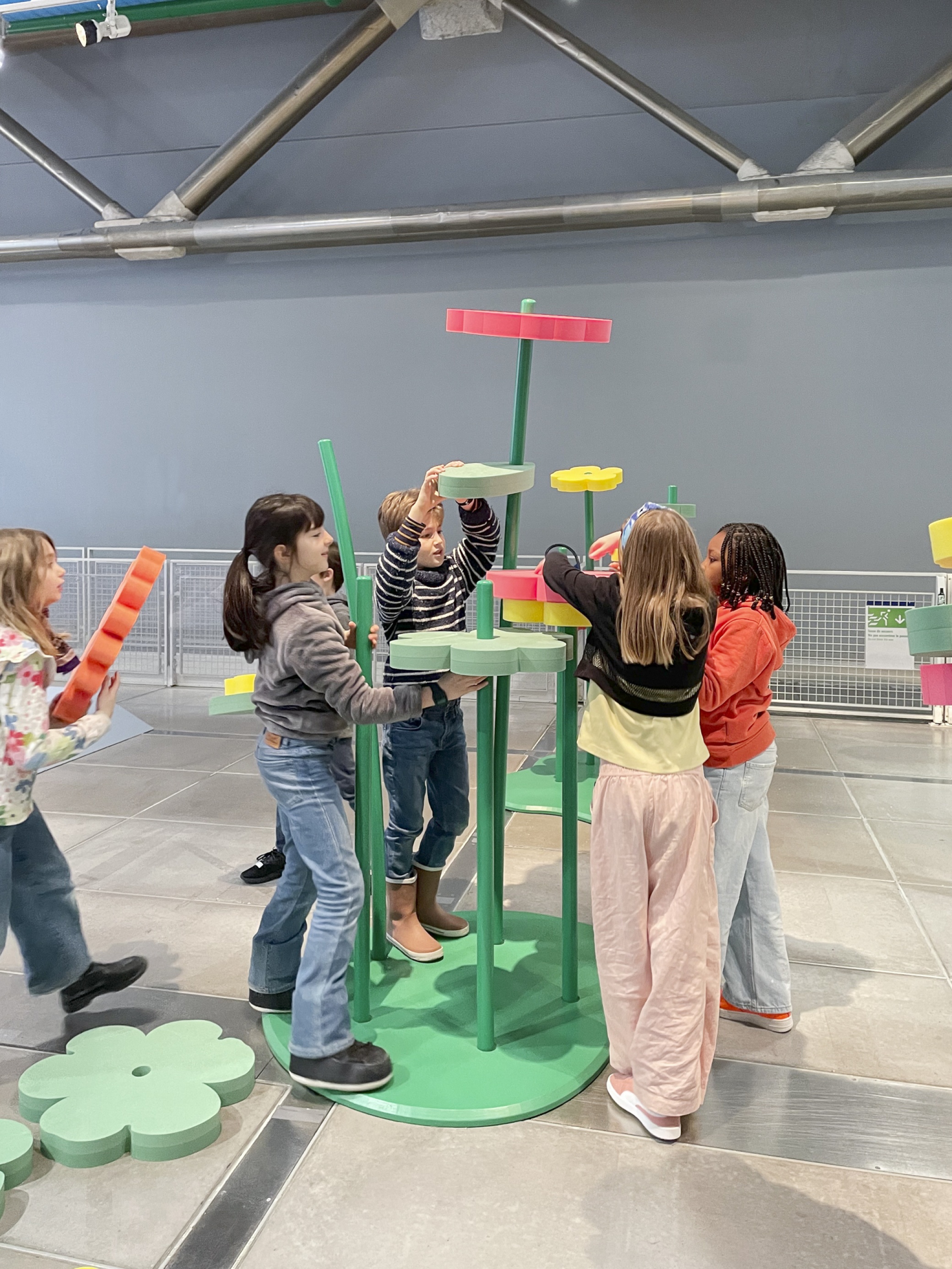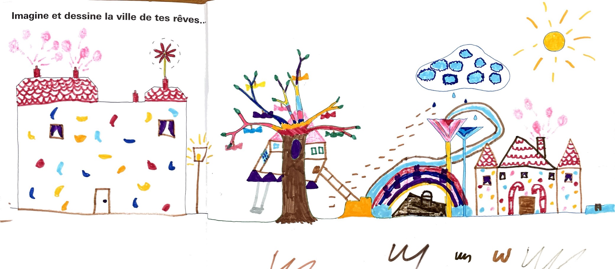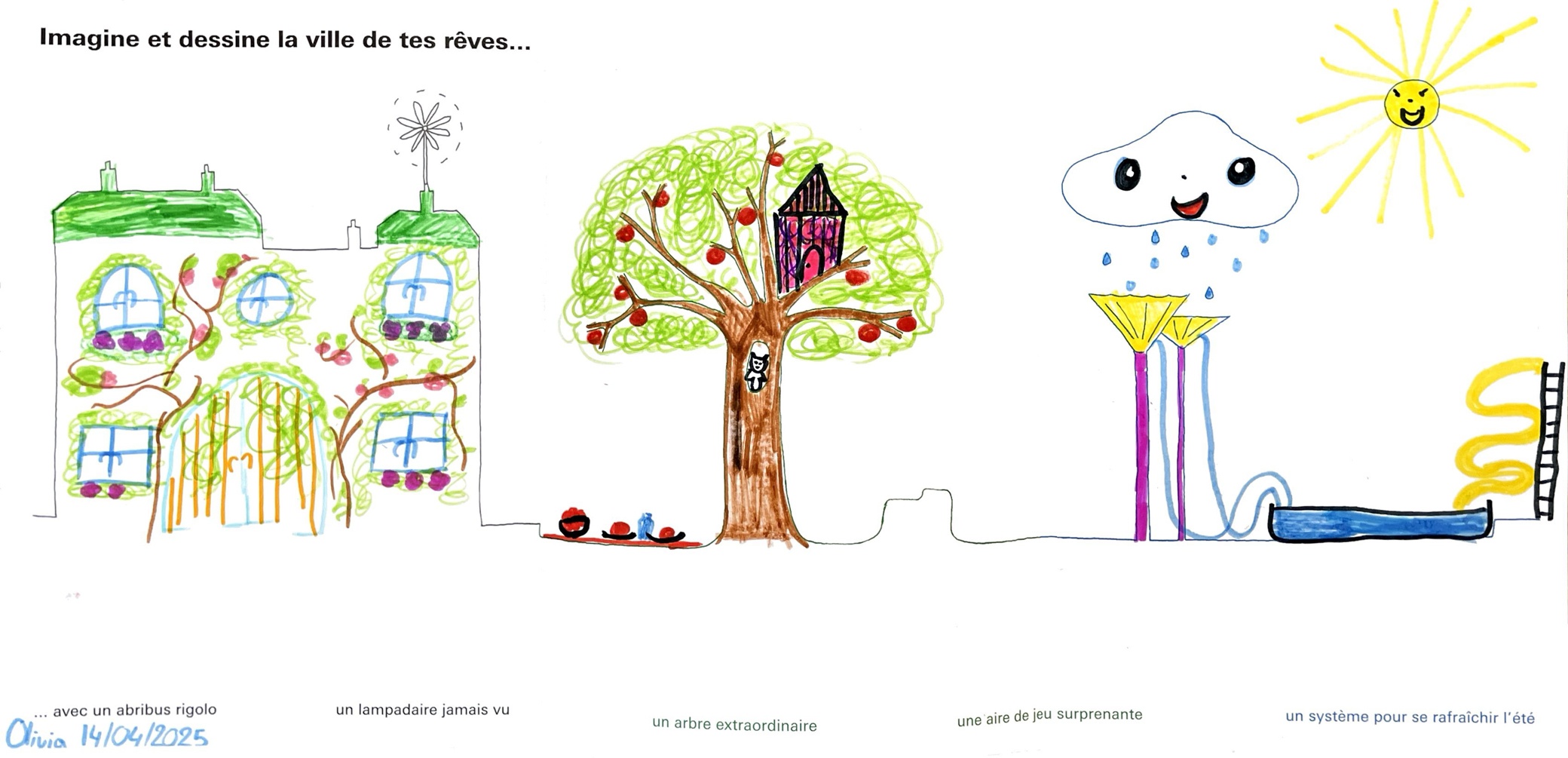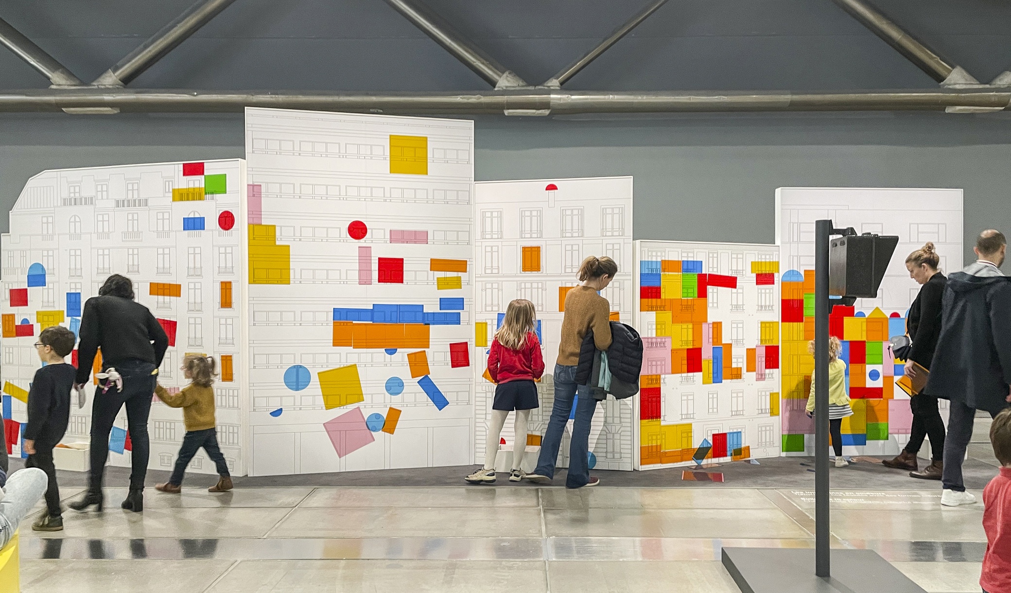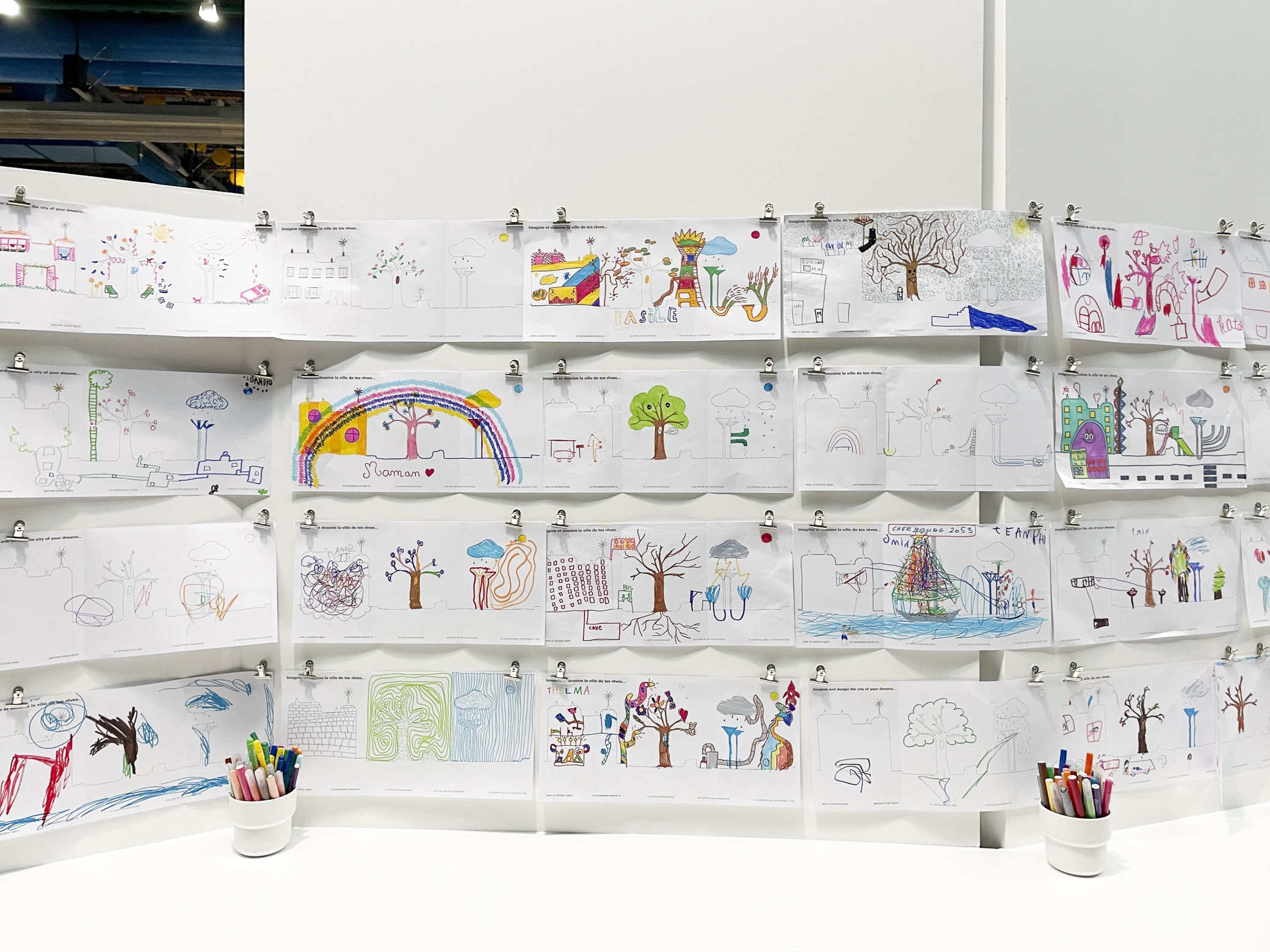 Dès l’entrée, un passage piéton avec de nouvelles règles permet de traverser en s’amusant avant d’inviter à la transformation de façades d’immeubles par des formes colorées. Un pommier, allusion à la présence rêvée de vergers dans la ville, porte sur ses fruits des questions sur le thème de la nature dans l’espace urbain. Les familles peuvent les cueillir et échanger sur un banc pensé pour toutes les tailles et les postures, tandis que des tuyaux sonores permettent d’écouter les réflexions des élèves ayant participé au projet – également disponibles sur cette page. Sara de.Gouy intègre en effet dans son travail de conception une démarche participative originale avec les publics : l’artiste a conçu son projet en dialogue avec les élèves de deux classes de CE1 d’une école élémentaire parisienne, ayant participé à un cycle d’ateliers au printemps 2024. Dans ce laboratoire de la future exposition-atelier, les élèves ont observé leur environnement, réinventé des objets et des espaces urbains pour réfléchir avec l’artiste à la ville de leurs rêves.