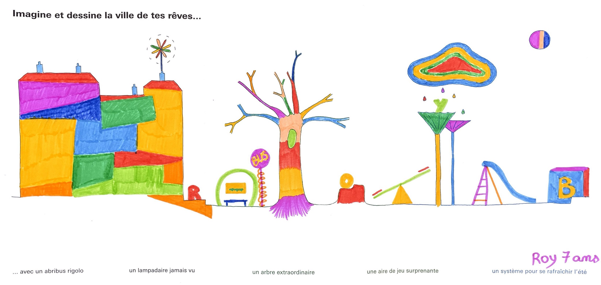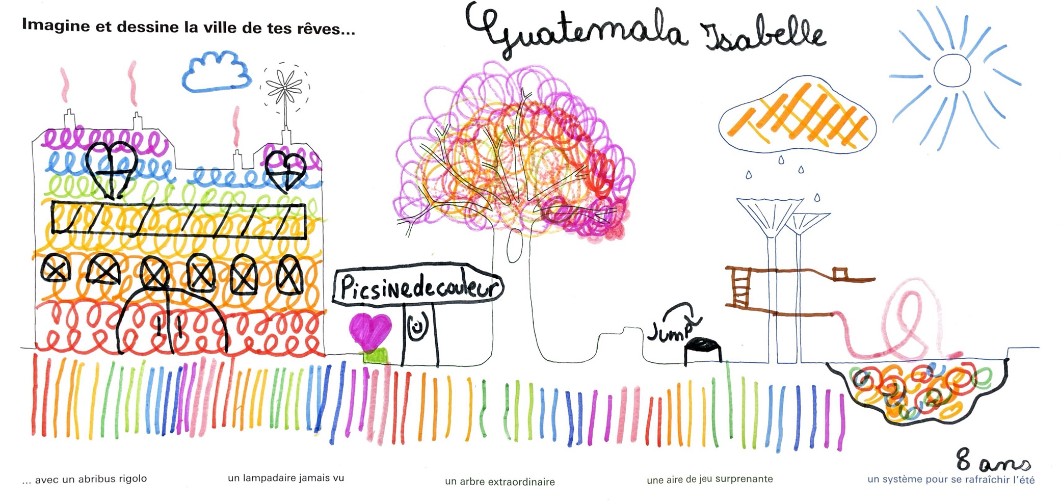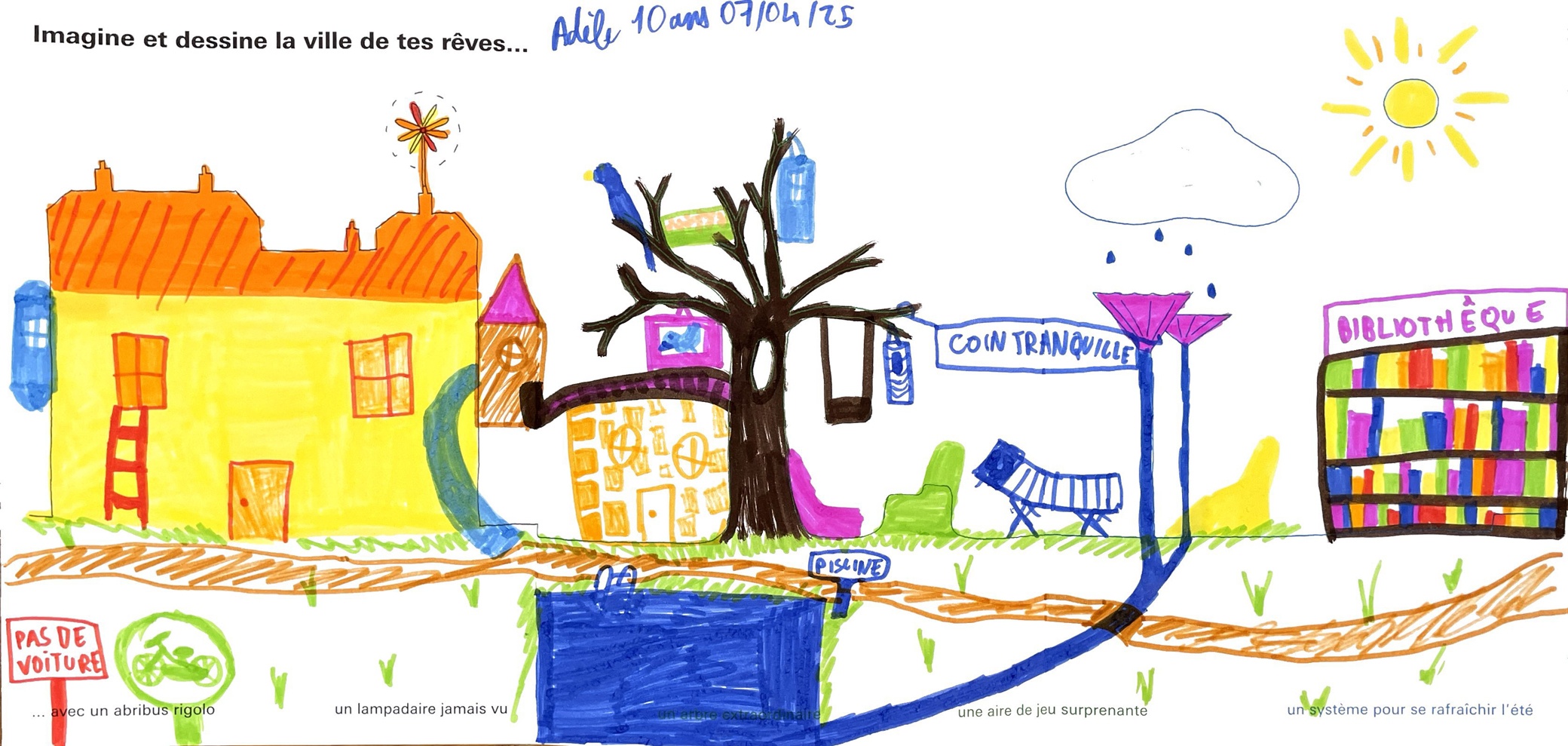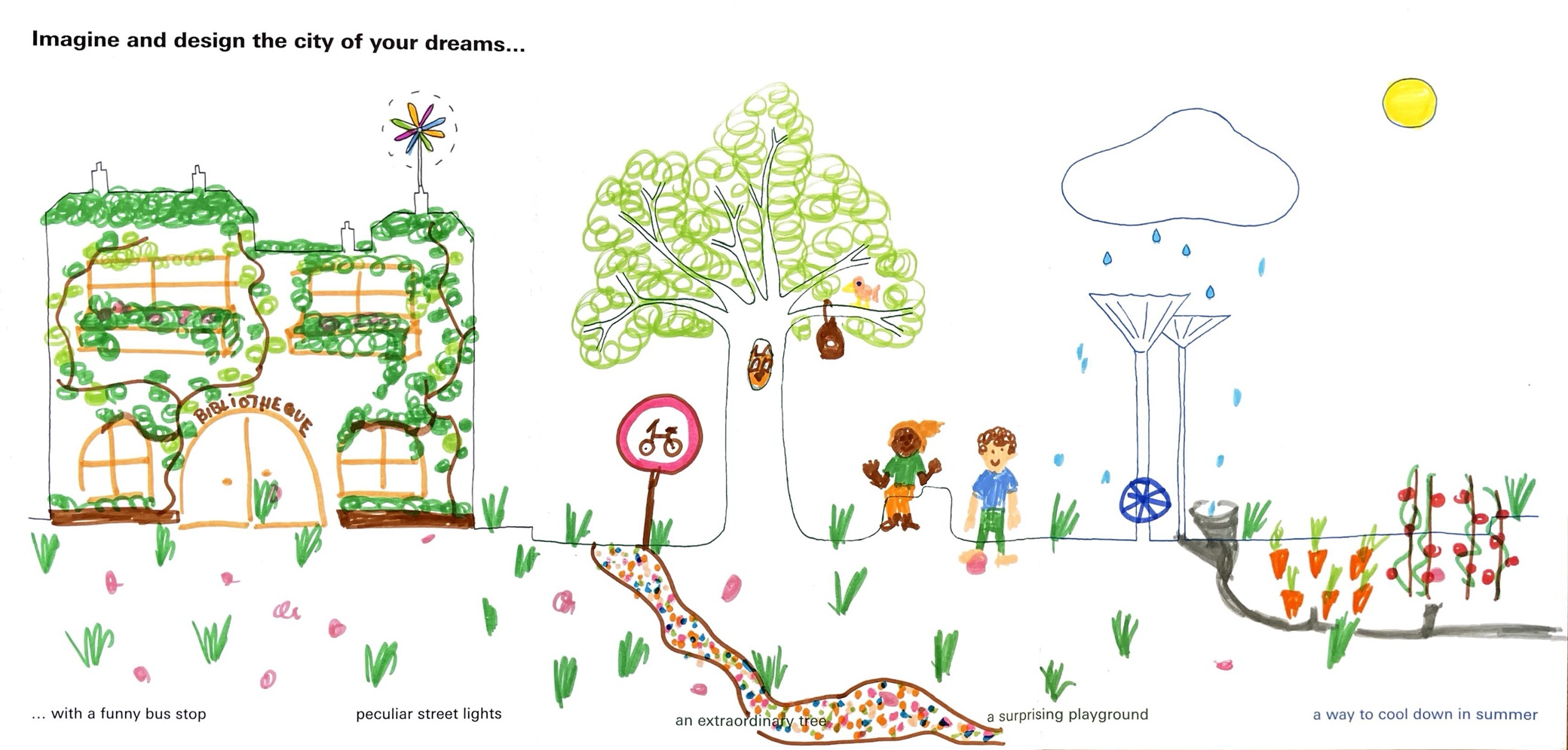 Dès l’entrée, un passage piéton avec de nouvelles règles permet de traverser en s’amusant avant d’inviter à la transformation de façades d’immeubles par des formes colorées. Un pommier, allusion à la présence rêvée de vergers dans la ville, porte sur ses fruits des questions sur le thème de la nature dans l’espace urbain. Les familles peuvent les cueillir et échanger sur un banc pensé pour toutes les tailles et les postures, tandis que des tuyaux sonores permettent d’écouter les réflexions des élèves ayant participé au projet – également disponibles sur cette page. Sara de.Gouy intègre en effet dans son travail de conception une démarche participative originale avec les publics : l’artiste a conçu son projet en dialogue avec les élèves de deux classes de CE1 d’une école élémentaire parisienne, ayant participé à un cycle d’ateliers au printemps 2024. Dans ce laboratoire de la future exposition-atelier, les élèves ont observé leur environnement, réinventé des objets et des espaces urbains pour réfléchir avec l’artiste à la ville de leurs rêves.