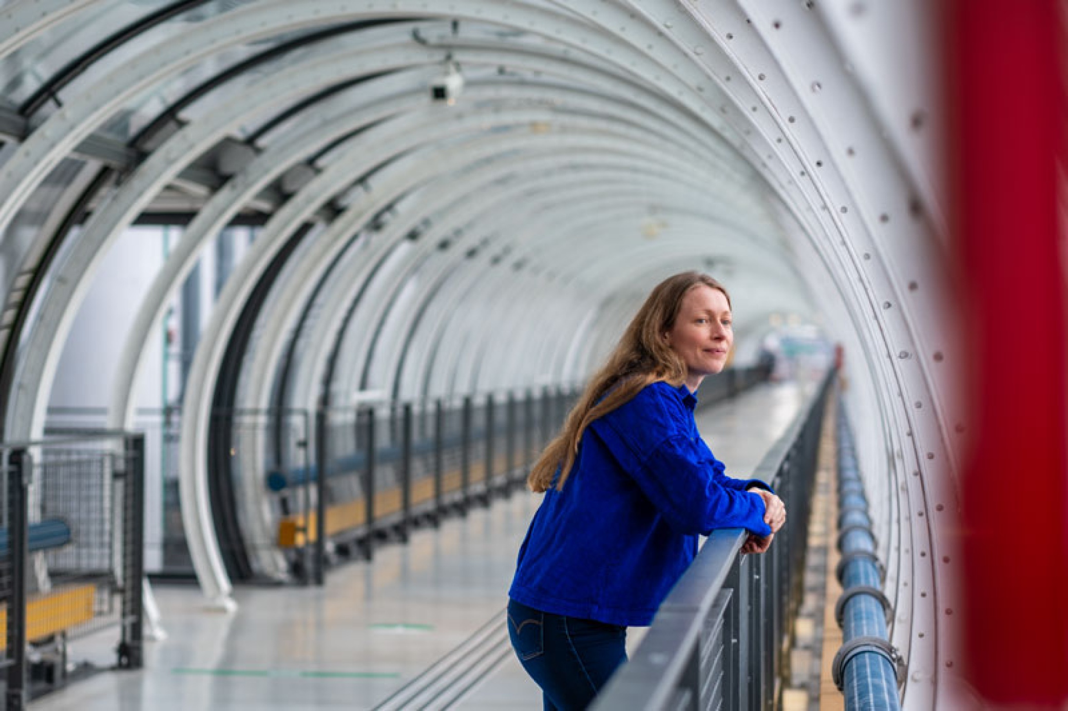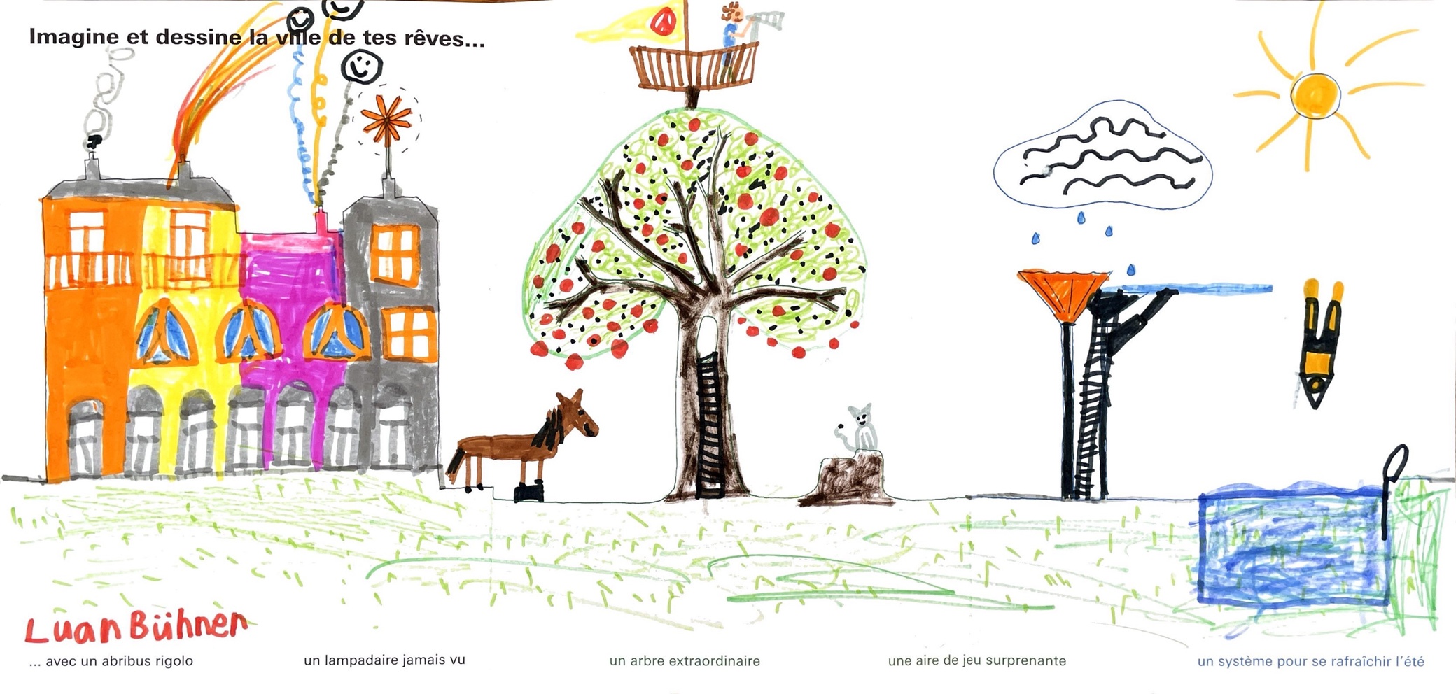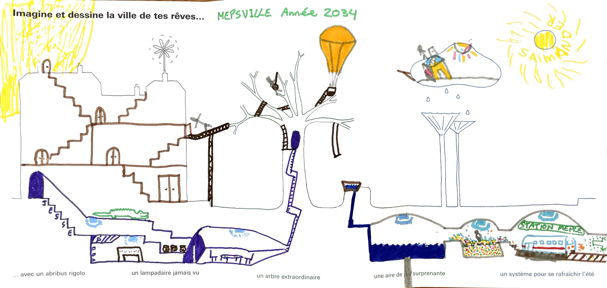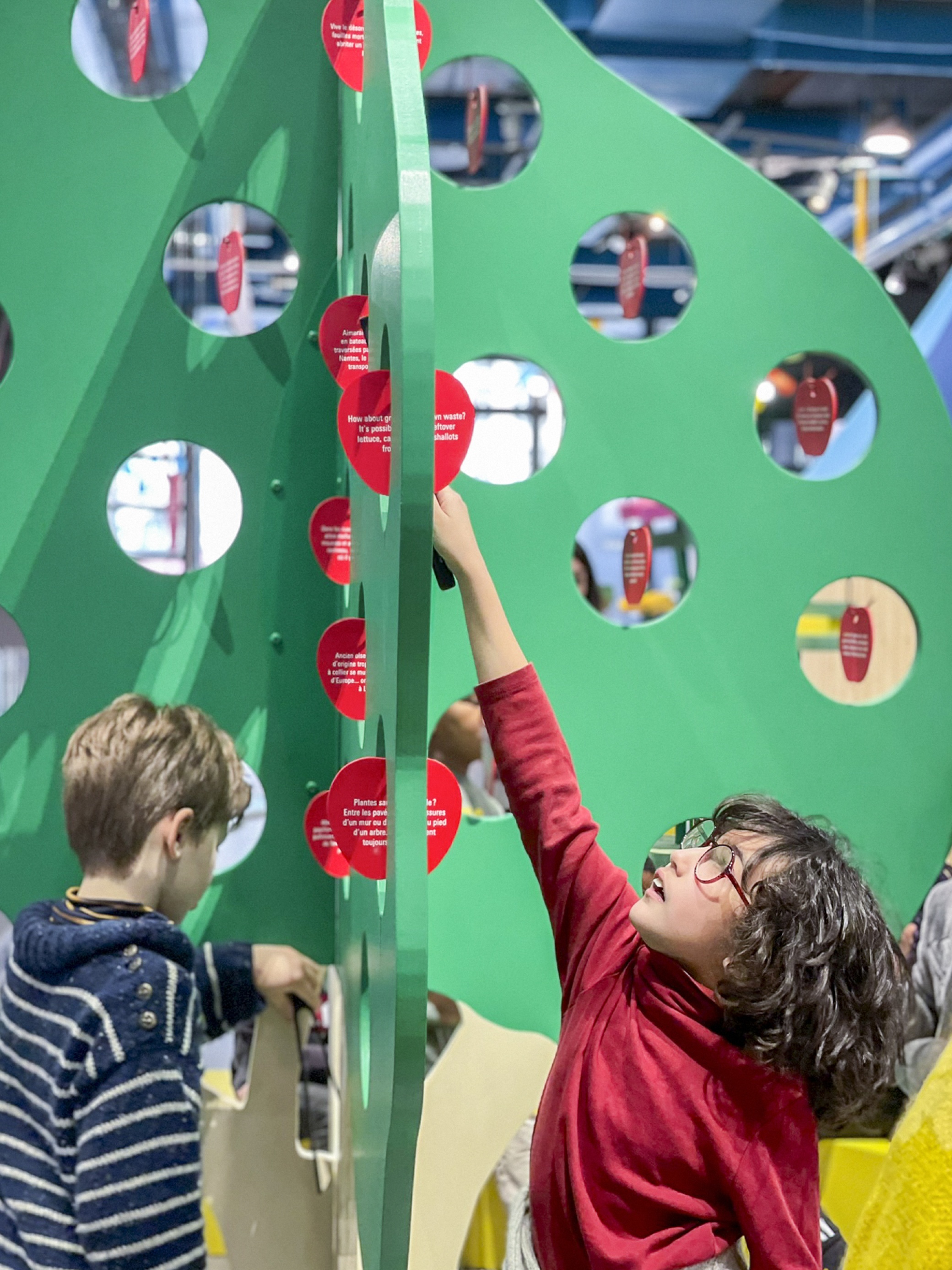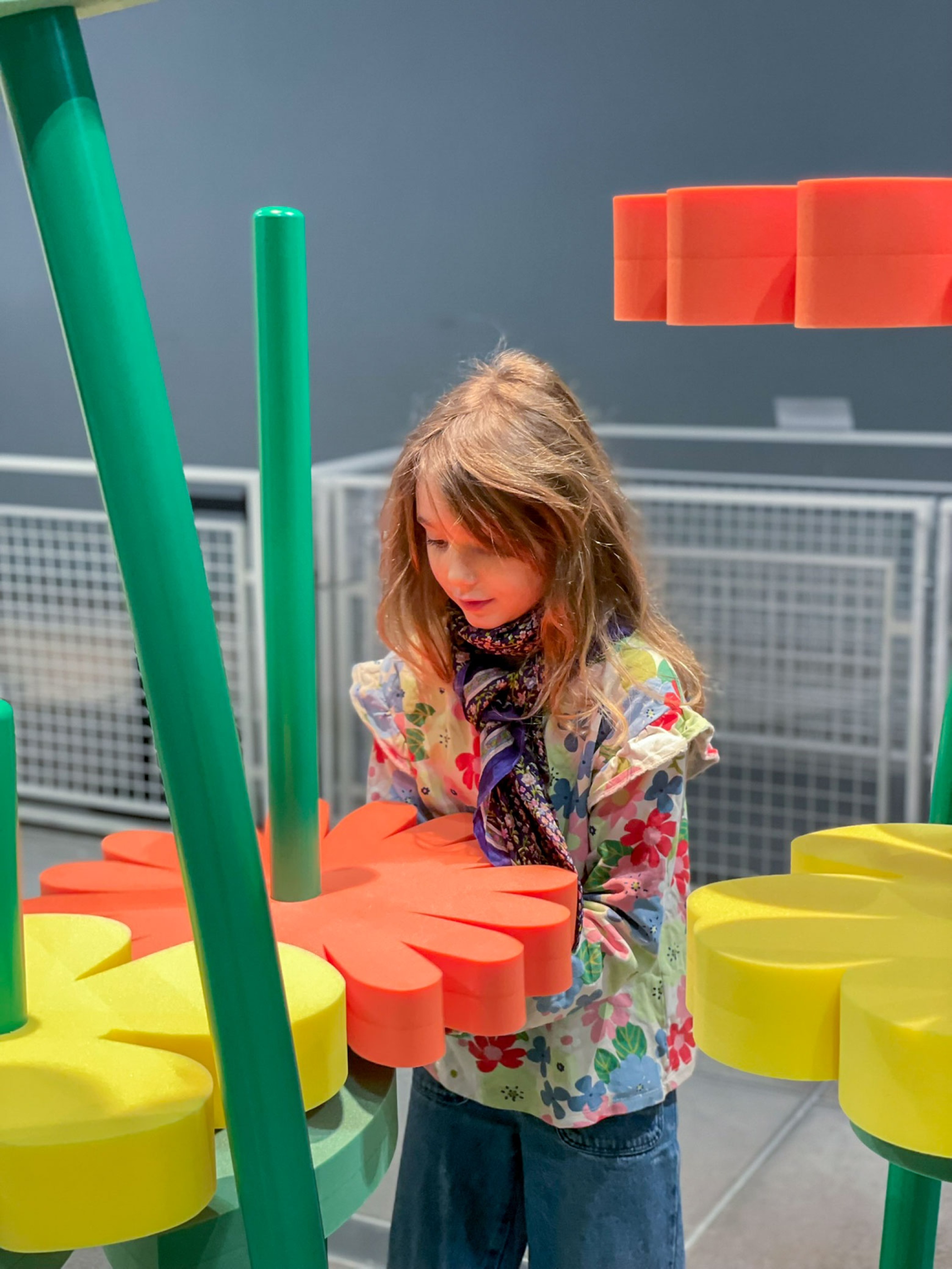 Dès l’entrée, un passage piéton avec de nouvelles règles permet de traverser en s’amusant avant d’inviter à la transformation de façades d’immeubles par des formes colorées. Un pommier, allusion à la présence rêvée de vergers dans la ville, porte sur ses fruits des questions sur le thème de la nature dans l’espace urbain. Les familles peuvent les cueillir et échanger sur un banc pensé pour toutes les tailles et les postures, tandis que des tuyaux sonores permettent d’écouter les réflexions des élèves ayant participé au projet – également disponibles sur cette page. Sara de.Gouy intègre en effet dans son travail de conception une démarche participative originale avec les publics : l’artiste a conçu son projet en dialogue avec les élèves de deux classes de CE1 d’une école élémentaire parisienne, ayant participé à un cycle d’ateliers au printemps 2024. Dans ce laboratoire de la future exposition-atelier, les élèves ont observé leur environnement, réinventé des objets et des espaces urbains pour réfléchir avec l’artiste à la ville de leurs rêves.