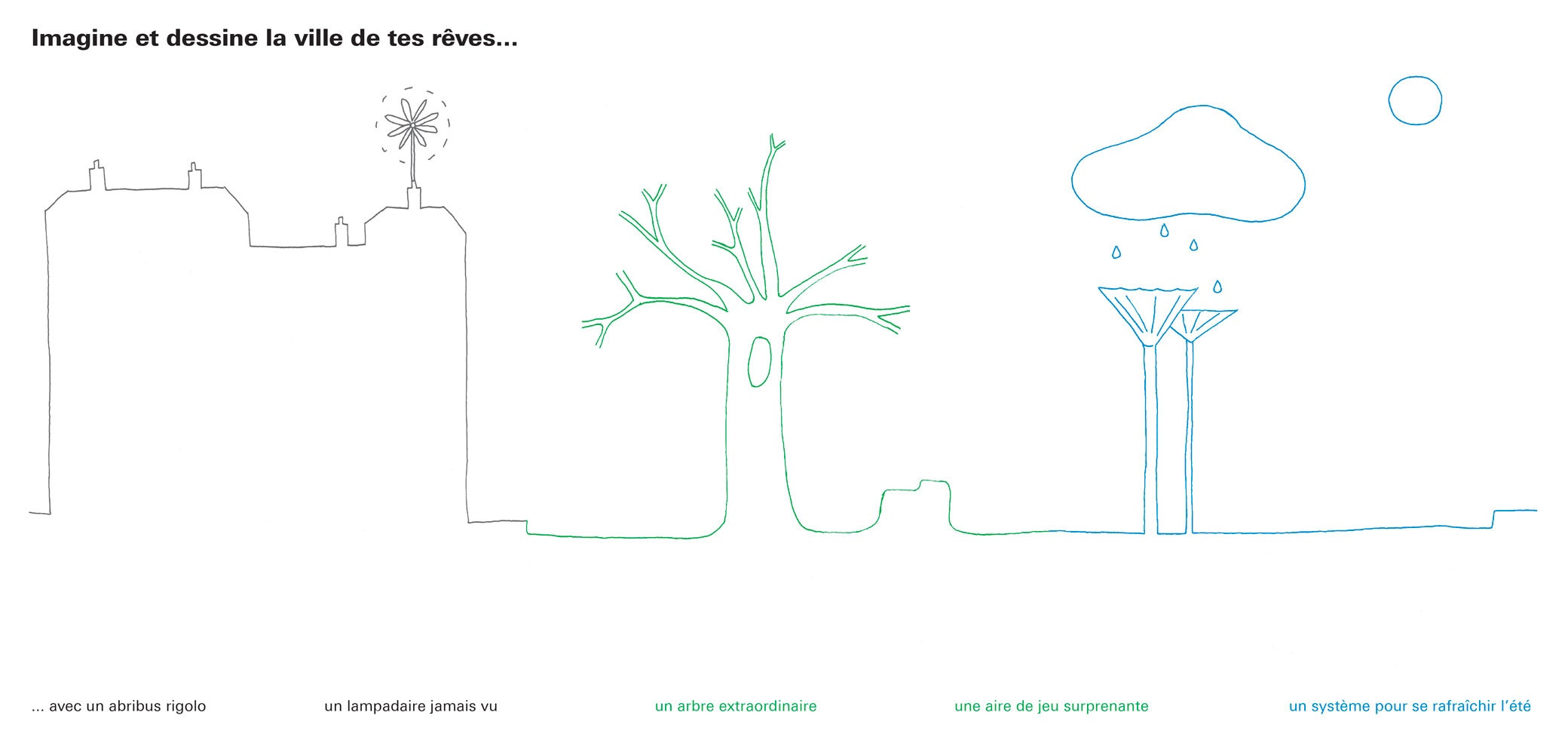 Dans la suite du parcours, un jardin à la végétation extraordinaire, image de la ville qui pousse, propose de composer ses propres fleurs imaginaires et des architectures précaires. Au cœur du jardin, une grande cabane au ciel étoilé appelle à prolonger la rêverie pour un temps calme et à se laisser envelopper par des senteurs de la nature. Dans cette ville climatique, les enfants escaladent les toits de la ville pour actionner des éoliennes, jouent avec des nénuphars, insectes et poissons dans un bassin-miroir alimenté par des gouttes de pluie. La ville de demain est en harmonie avec le vivant et les éléments naturels : le soleil, la pluie, le vent.