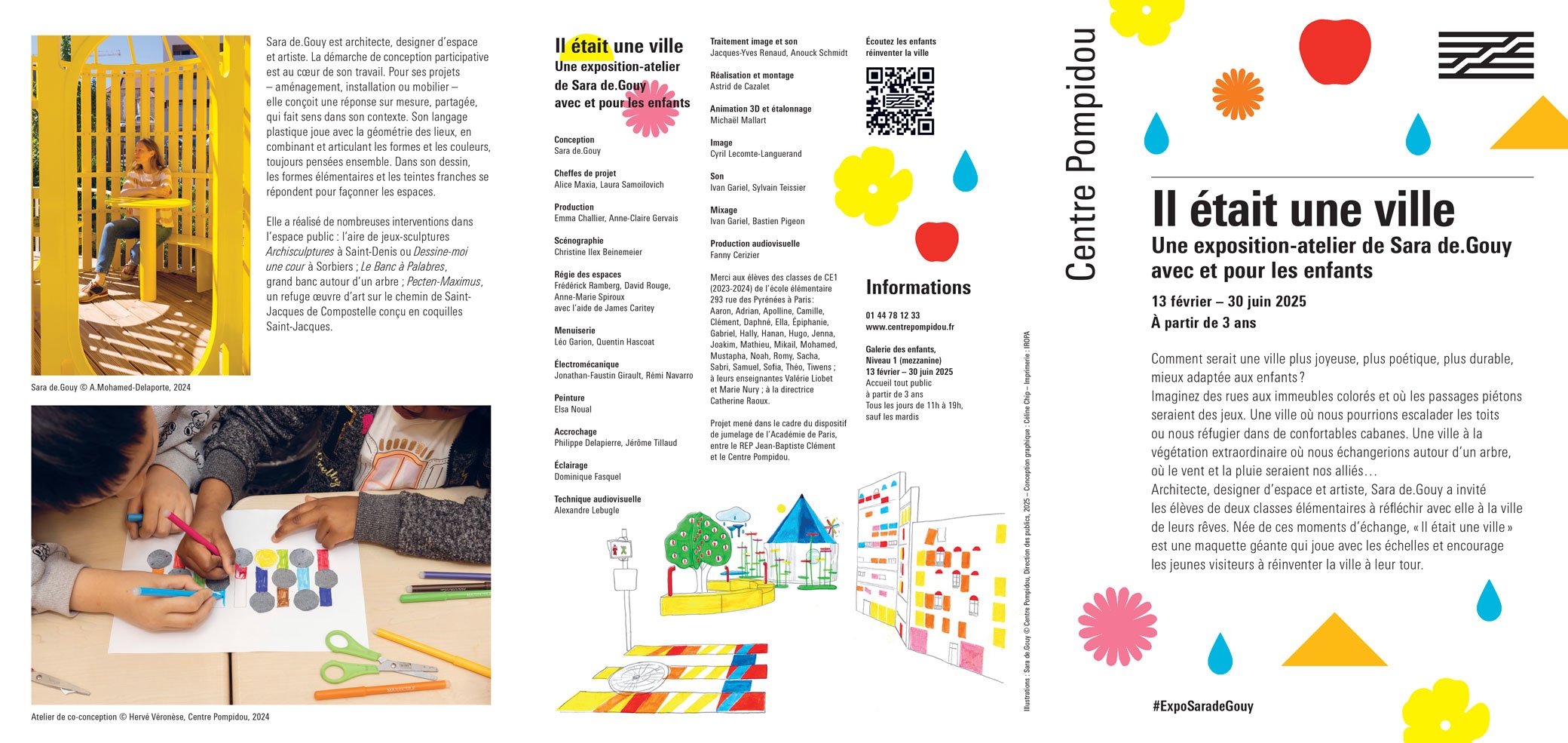 « Il était une ville », exposition-atelier conçue pour la Galerie des Enfants au Centre Pompidou propose d’imaginer et d’expérimenter une ville plus joyeuse, plus poétique, plus durable, adaptée aux enfants. Pensé comme une grande maquette, le dispositif joue avec les échelles, celle de la ville et celle des jeunes visiteurs.
