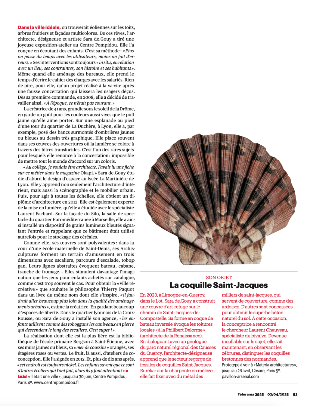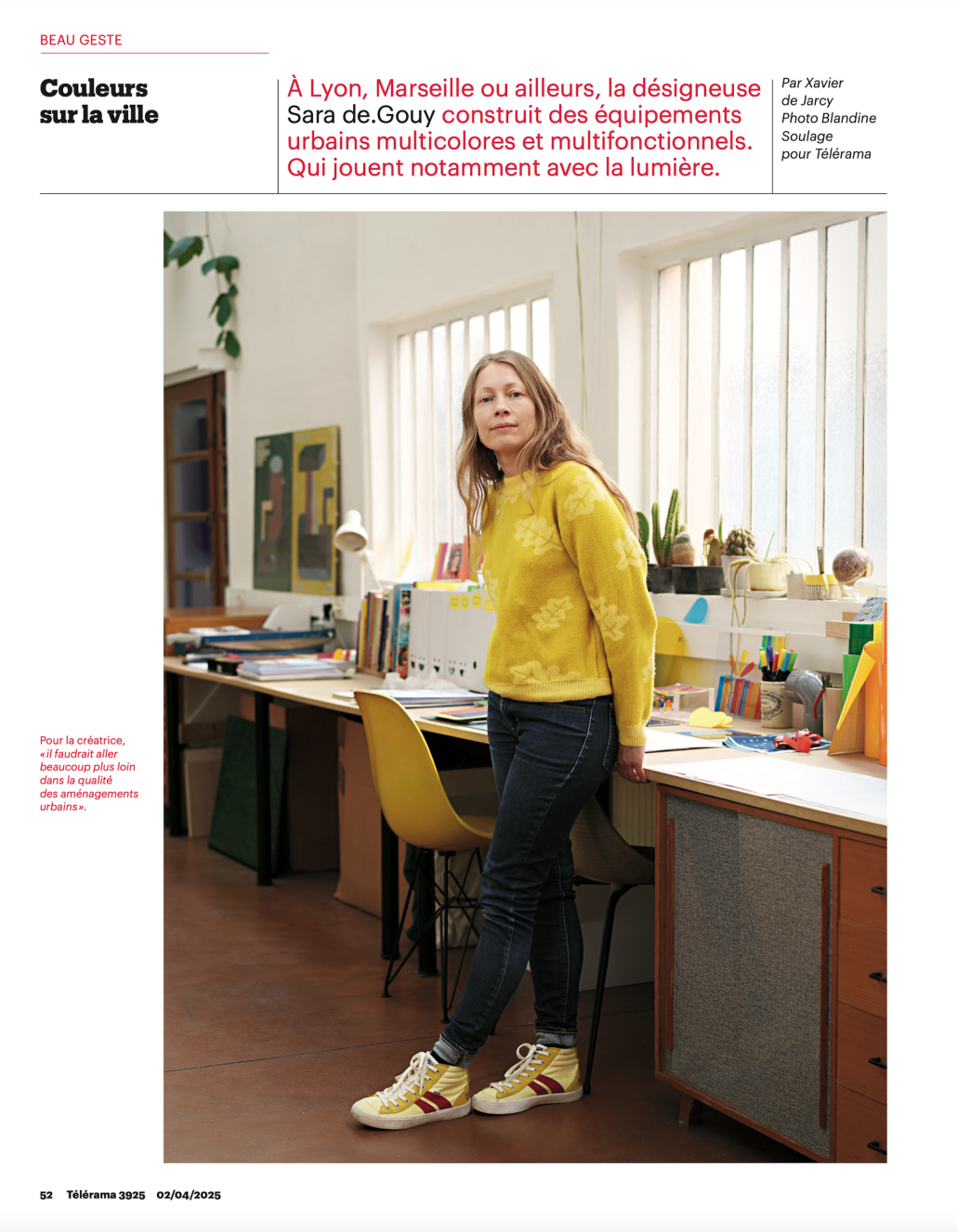 Rubrique Beau Geste, portrait «A Lyon, Marseille ou ailleurs, la designeuse Sara de.Gouy construit des équipements urbains multicolores et mulitfonctionnels. Qui jouent notamment avec la lumière.» 2 pages